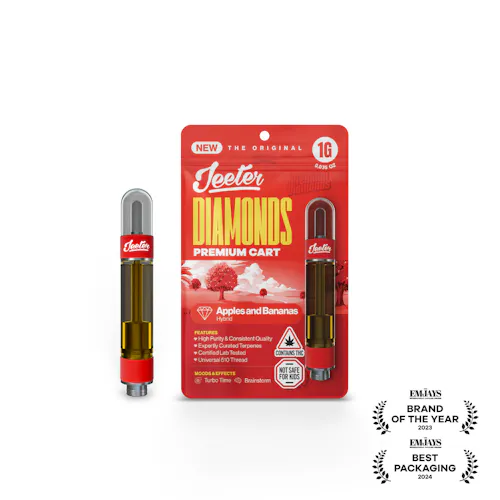 Jeeter's Apples & Bananas is a flavorful, balanced hybrid known for its sweet, fruity taste of sugary bananas and tart apples with a peppery finish, paired with a spicy, diesel aroma, delivering uplifting euphoria, relaxation, and creativity, often featuring strong potency through liquid diamonds or infusions. It's crafted from Cookies and Compound Genetics, creating a bold, layered experience for both mind and body, ideal for balanced effects, according to.