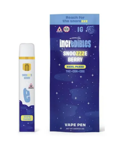 Drift into a tranquil slumber with Snoozzzeberry, a disposable vaporizer from Urb featuring a soothing blend of Blueberry Haze and the comforting essence of blueberries. Incredibles disposables are filled with 3ml of a proprietary hemp derived cannabinoid and terpene blend designed to help you get a good night’s sleep.