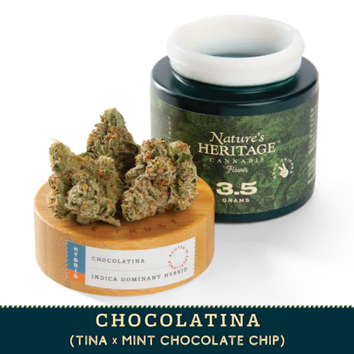 Chocolatina by Nature's Heritage is a potent, indica-dominant hybrid strain (Tina × Mint Chocolate Chip) known for its sweet, minty chocolate, and diesel flavor profile. This strain often features high THC and offers a relaxing, euphoric, and creative high, making it ideal for unwinding.