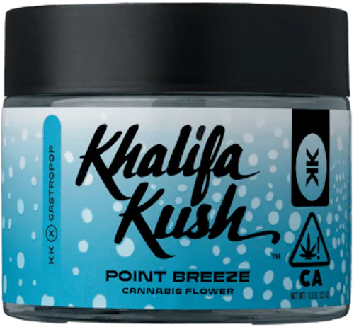 Point Breeze is a weed strain, released by Khalifa Kush in 2025. Point Breeze is a cross of Khalifa Kush x Gastro Pop. Point Breeze has big, bubbly, purple-pointed trichome covered buds. Point Breeze should taste like grape bubblegum mixed with classic diesel fuel. Point Breeze should taste like a mix of its parents with KK gas notes followed by a unique berry candy aroma straight from its Gastro Pop lineage. Point Breeze feels like a top-of-head trip to the upper atmosphere, slowly drifting you back to earth to keep your day moving. Point Breeze's top terpenes are myrcene, limonene , b-caryophyllene, and linalool.